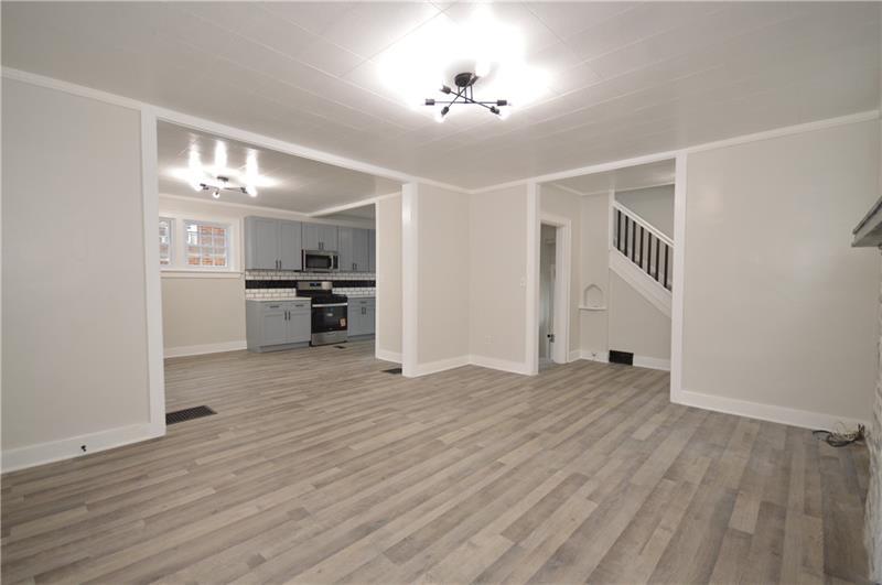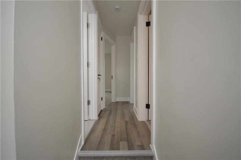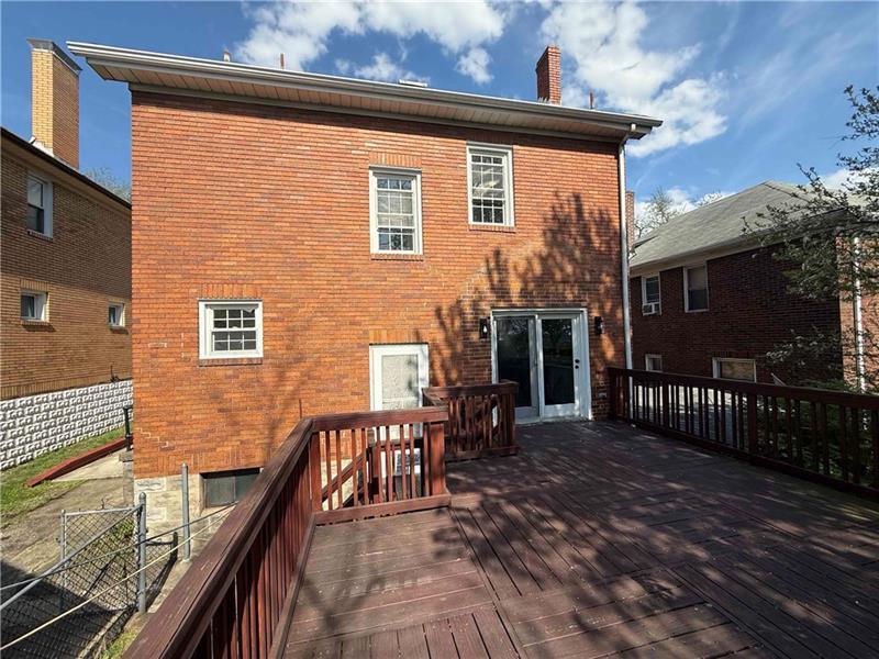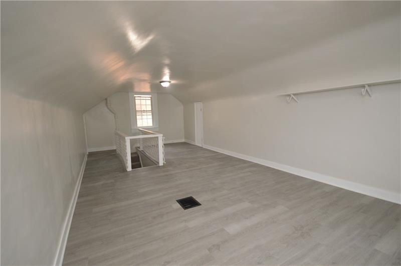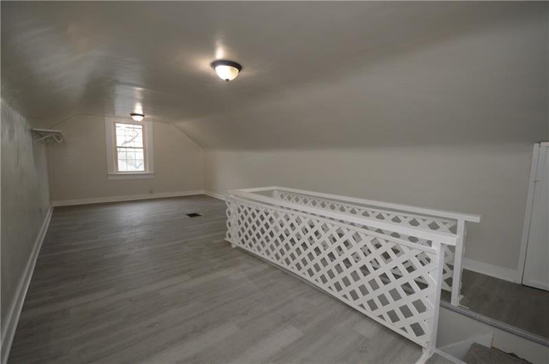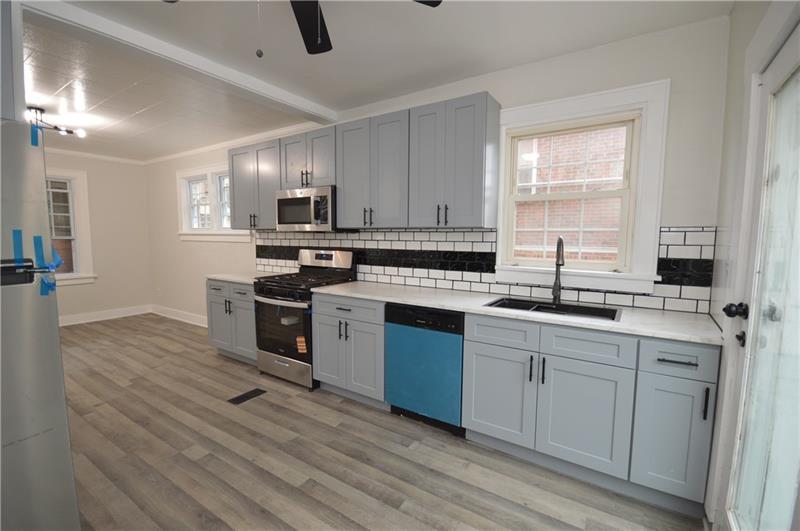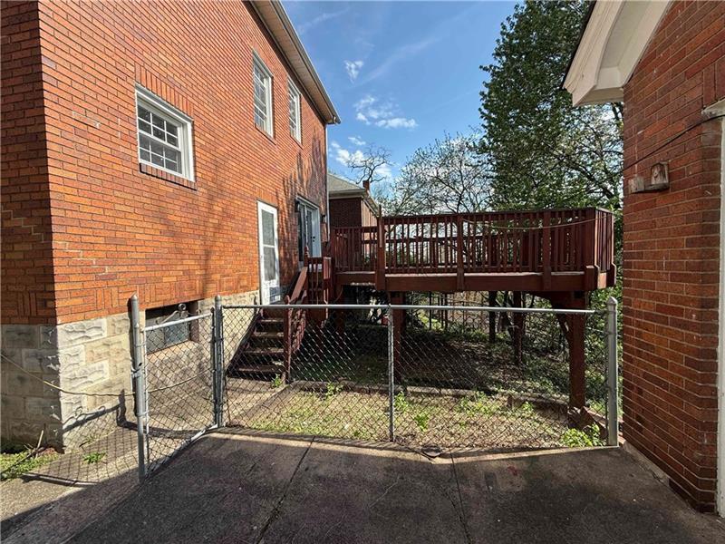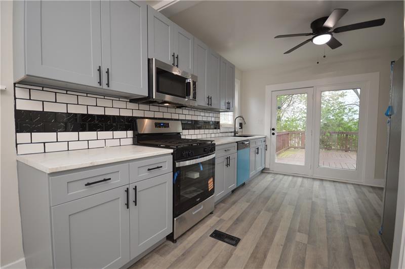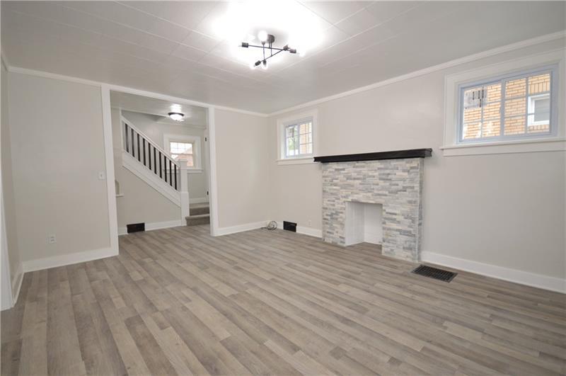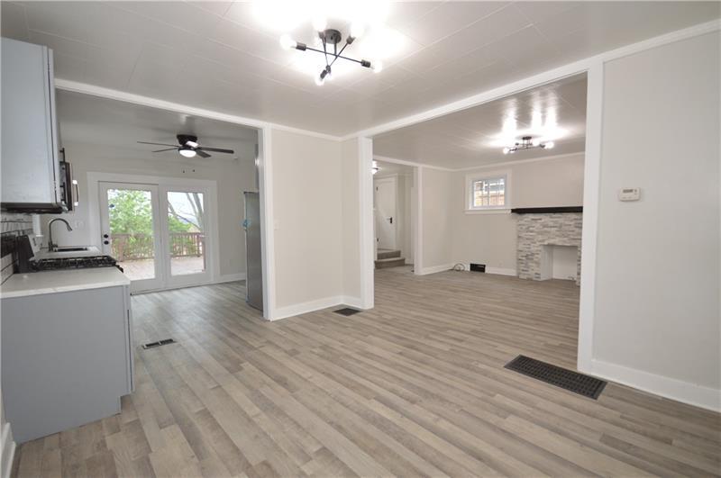 Sweet renovation of this classic 3-bedroom brick home. Beautiful gray laminate flooring throughout first floor. large living room with decorative stone fireplace. opens to dining area to kitchen. Easy flow from cooking to dining. set up well for having guests or just yourself. Kitchen has lovely gray cabinets and plenty of them with white granite countertops and a white and black backsplash. Deck off of kitchen perfect for setting up a grill and table and enjoying the peace and beauty of the backyard. Which awaits your gardening touches. Side entrance from driveway has cute phone nook and coat closet on the steps heading to the second floor. Attractively painted banister and balustrades. Second floor has 3 very pleasant bedrooms and a beautifully renovated full bathroom. Continue on up and be welcomed by a large, open finished attic. wonderful space for office or gaming. Large open basement, makes it easy to do laundry and has plenty of room for storage. One car detached garage.