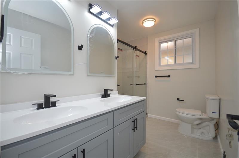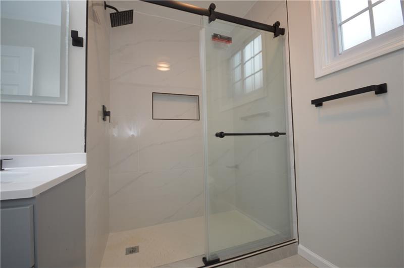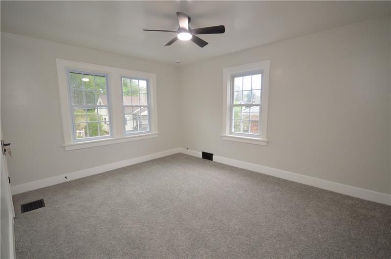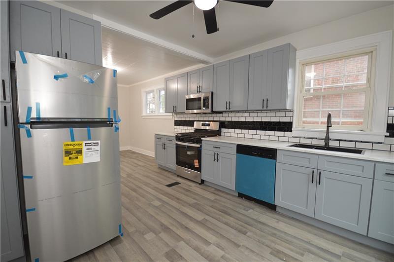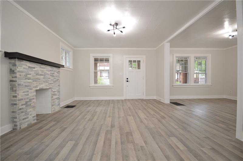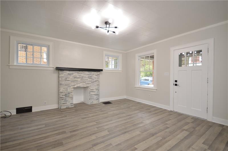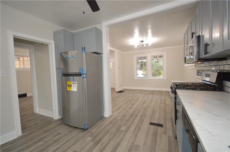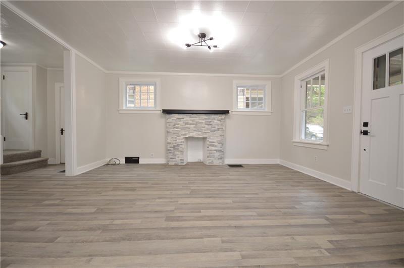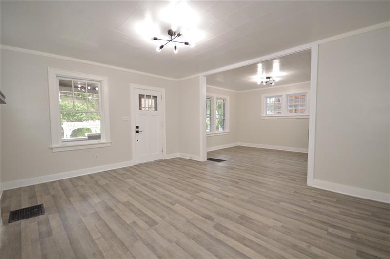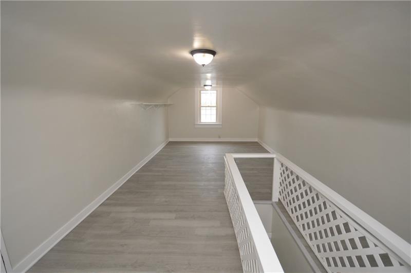 Sweet renovation of this classic 3-bedroom brick home. Beautiful gray laminate flooring throughout first floor. large living room with decorative stone fireplace. opens to dining area to kitchen. Easy flow from cooking to dining. set up well for having guests or just yourself. Kitchen has lovely gray cabinets and plenty of them with white granite countertops and a white and black backsplash. Deck off of kitchen perfect for setting up a grill and table and enjoying the peace and beauty of the backyard. Which awaits your gardening touches. Side entrance from driveway has cute phone nook and coat closet on the steps heading to the second floor. Attractively painted banister and balustrades. Second floor has 3 very pleasant bedrooms and a beautifully renovated full bathroom. Continue on up and be welcomed by a large, open finished attic. wonderful space for office or gaming. Large open basement, makes it easy to do laundry and has plenty of room for storage. One car detached garage.